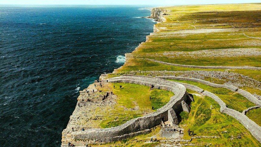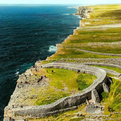 Mitjançant la combinació de curts desplaçaments en minibusos locals i una ruta a peu descobrirem el lloc més emblemàtic de l’illa que és el fort de Dún Aonghasa. Aquesta fortificació de l’edat del ferro presenta unes muralles concèntriques que s’alcen de manera inversemblant a la vora de penya-segats vertiginosos que cauen a l’oceà Atlàntic. Es tracta d’una de les postals més belles d’Irlanda on la pedra i el mar es troben en un abisme de més de vuitanta metres d’alçada.